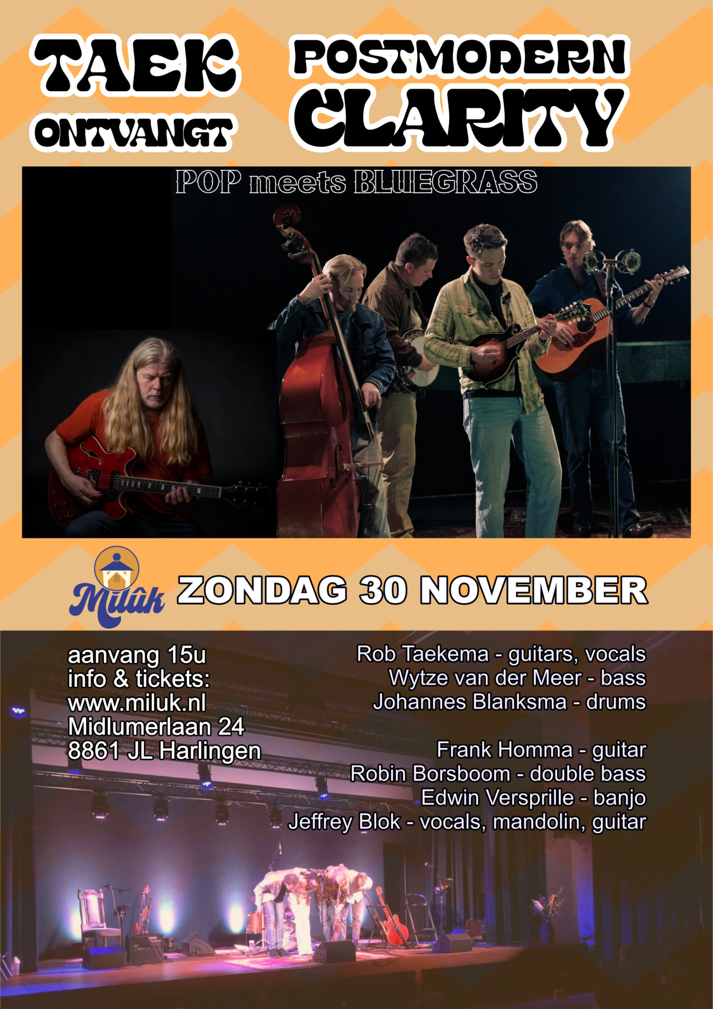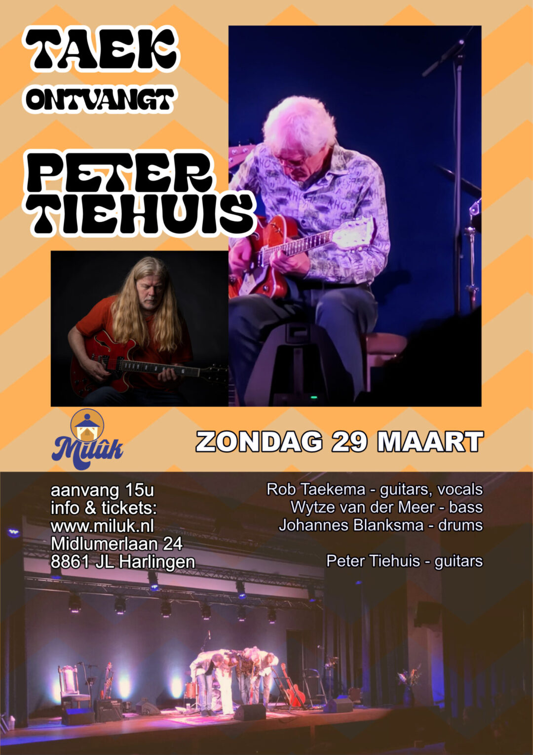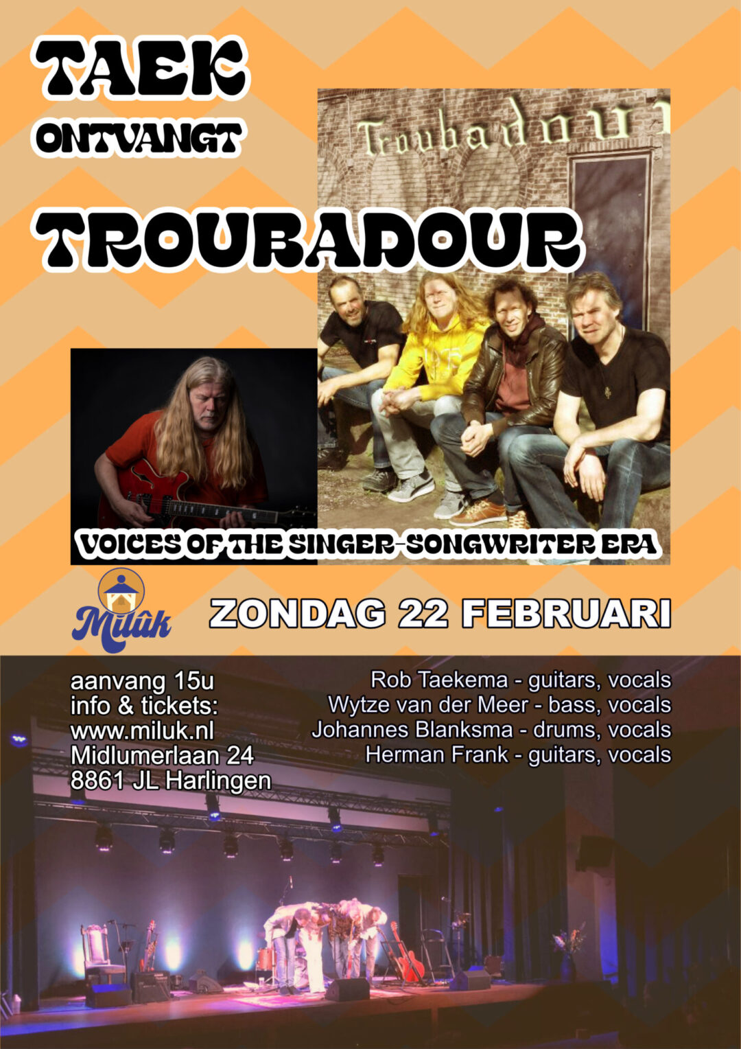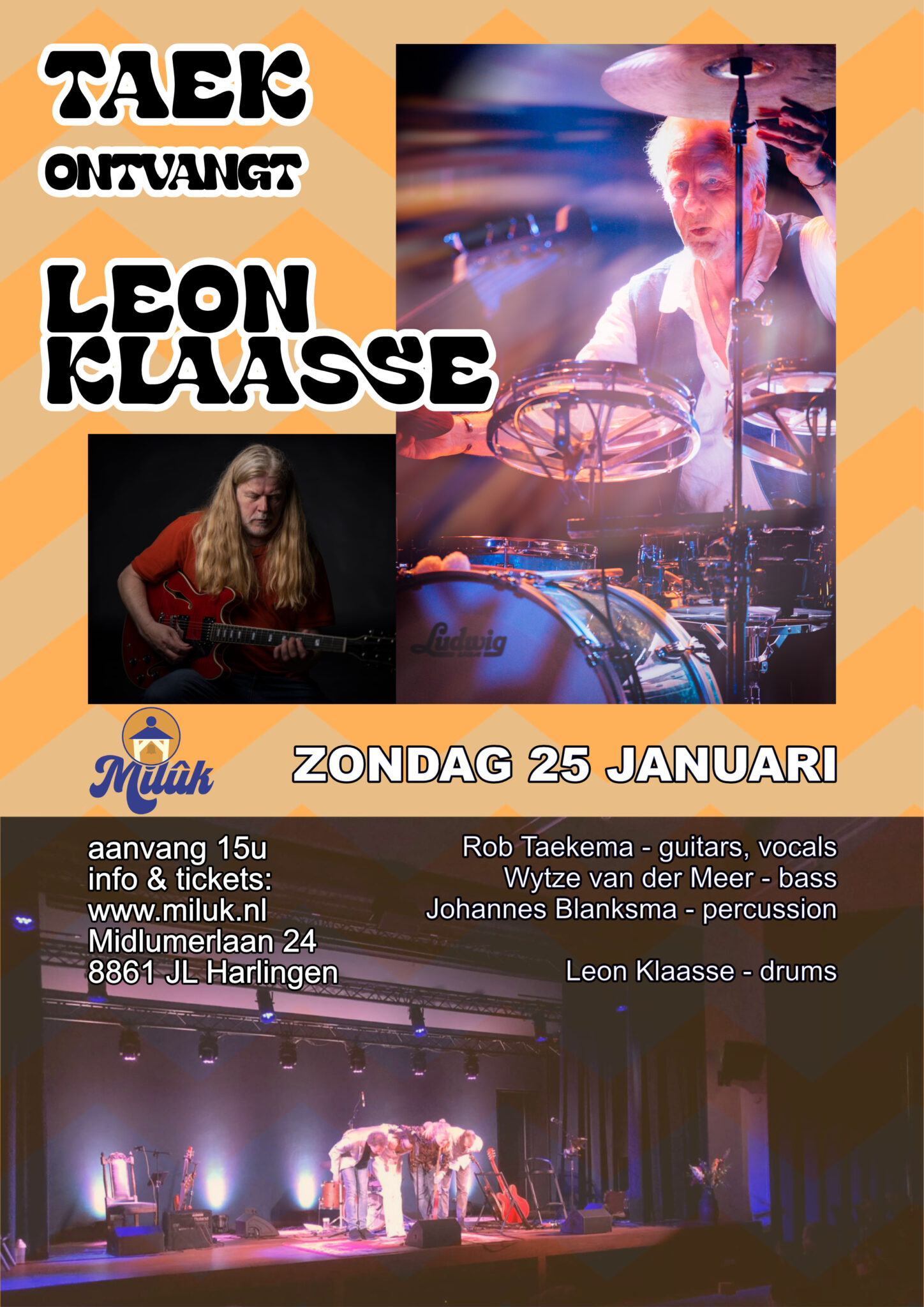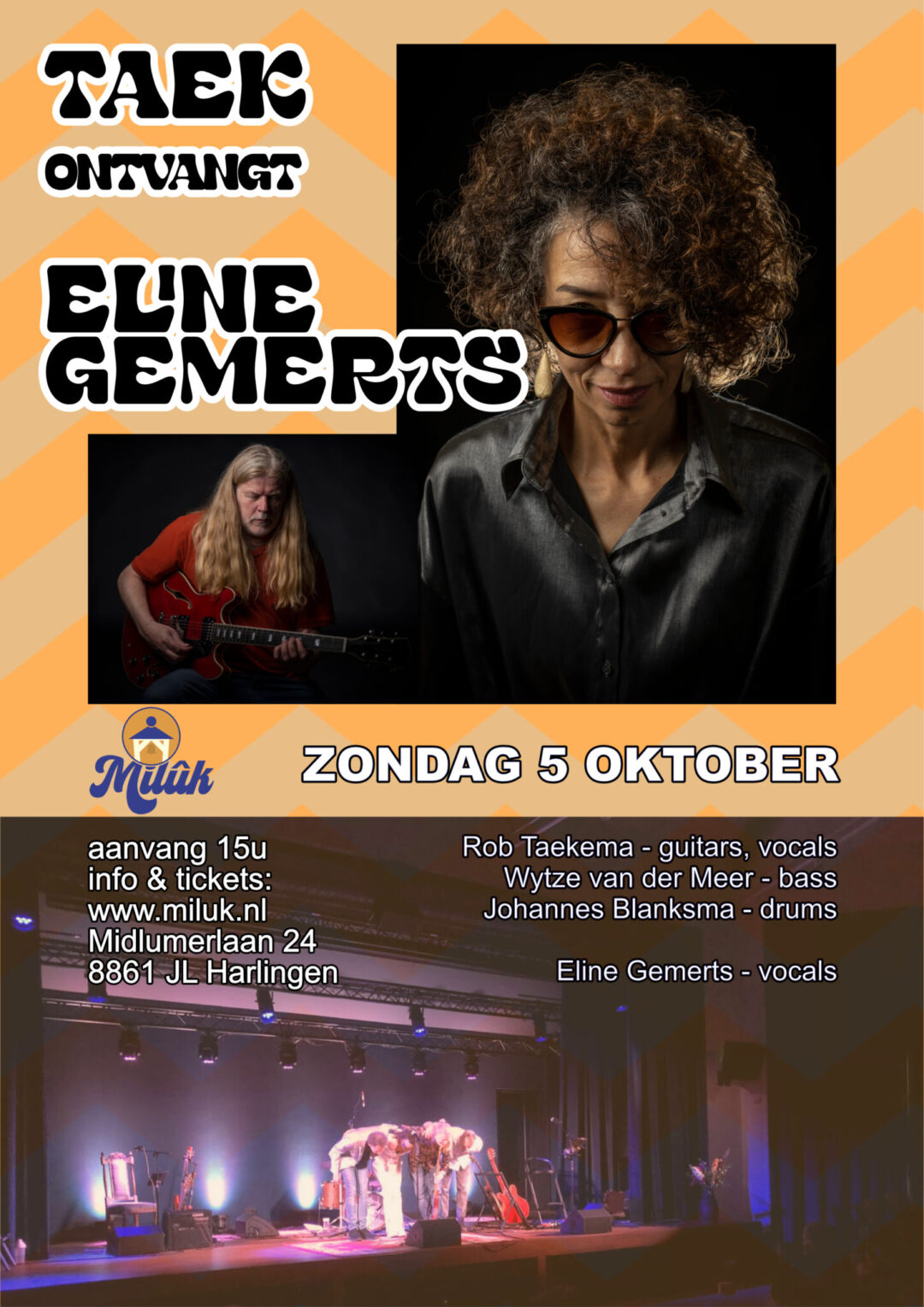 Dit jaar heeft Milûk weer de eer om muzikale artiest Rob Taekema, woonachtig in Harlingen, als gastheer op het podium te verwelkomen. Rob is onder andere bekend van de band Fruitcake. Op de laatste zondagmiddag van de maand nodigt hij, samen met Wytze van der Meer op bas en Johannes Blanksma op drums, een muzikale vriend uit voor een bijzondere middag vol muziek en creativiteit.Wil je meer weten over Rob en zijn muziek? Neem dan een kijkje op zijn website: taek.nl of bekijk onze agenda voor data en tijden!